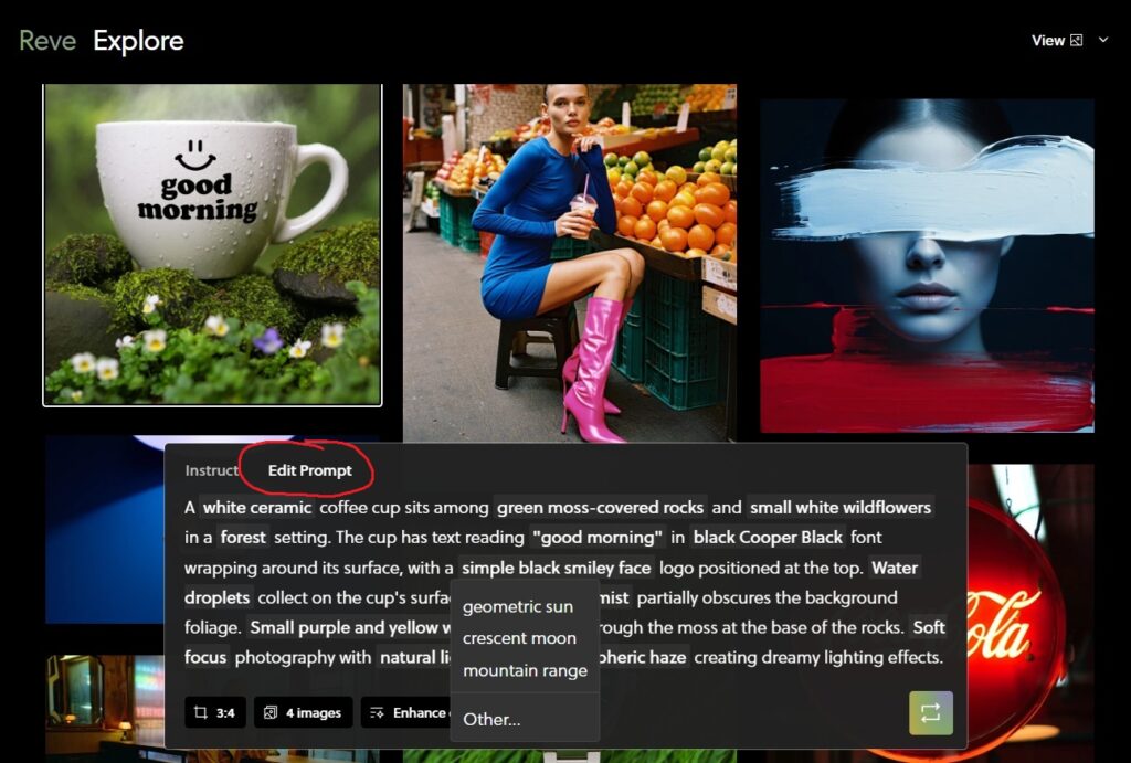 In Reve kannst du für jedes von dir erstellte Bild und für jedes Bild der Community den Prompt anschauen. Klicke dafür einfach auf das Bild und klicke auf „Edit Prompt“: